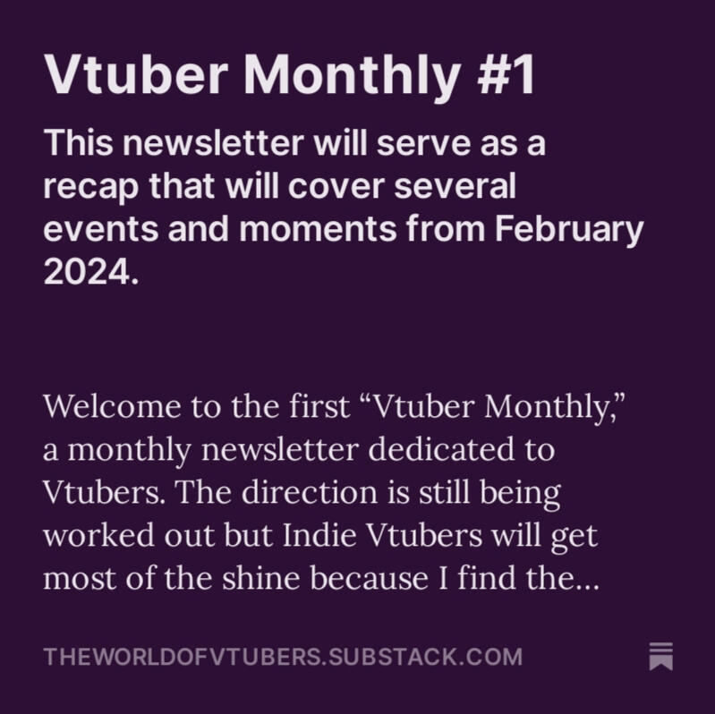Vtuber Monthly is a newsletter that covers announcements/news, events, debuts, and other things within the Vtuber community.